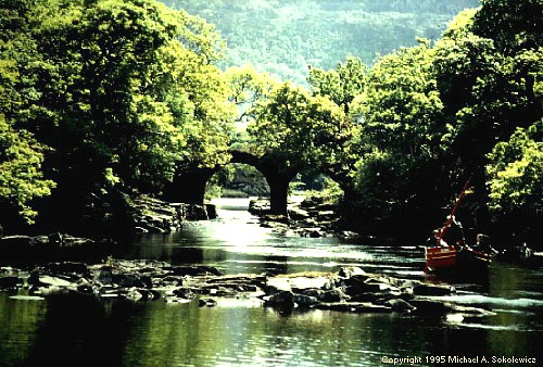 This was taken in Ireland. The splash of red the tourboat gives is a nice accent to this green-dominated, pastoral picture.